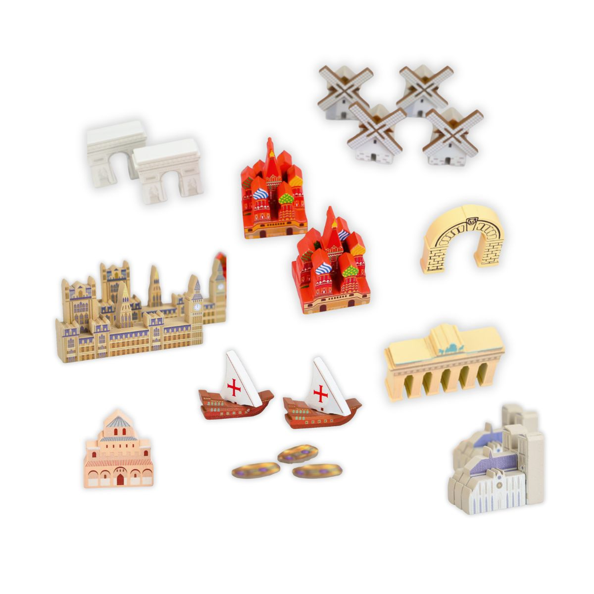 Com duas formas de jogar, a expansão se adapta ao seu estilo. No modo tradicional, os monumentos podem ser embaralhados junto ao baralho do jogo base. Já no Modo Europa, os jogadores recebem cartas exclusivas da expansão, que adicionam surpresas e decisões únicas durante a partida. Esses monumentos oferecem bônus poderosos, como recursos imediatos, ações livres, reposicionamento de peças e formas alternativas de pontuar, proporcionando ainda mais caminhos para a vitória.